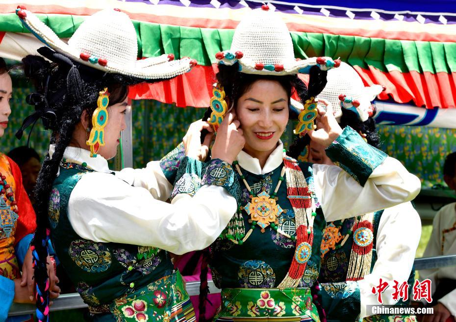 6月28日,拉薩首屆林卡囊瑪堆諧大賽在達孜區(qū)舉辦?,F(xiàn)場,經(jīng)過前期海選入圍的19支隊伍依次上臺競技。囊瑪和堆諧,合稱囊瑪堆諧,是西藏民間歌舞發(fā)展到較高層次、集歌舞樂為一體的珍貴傳統(tǒng)文化藝術(shù)遺產(chǎn),深受當?shù)孛癖姷南矏叟c追捧。圖為首屆林卡囊瑪堆諧大賽比賽現(xiàn)場,參賽隊伍正在整理妝容。