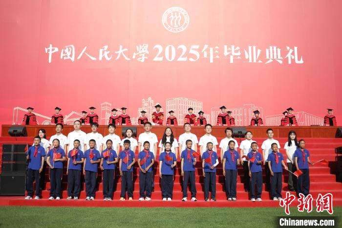 6月23日,中國人民大學(xué)2025年畢業(yè)典禮現(xiàn)場,措果鄉(xiāng)中心小學(xué)的孩子們與人大畢業(yè)生們小手牽大手,相伴而立,共同唱響了《萬疆》。主辦方供圖
