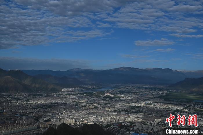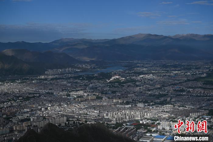 7月5日清晨,西藏拉薩市在薄霧中朦朧蘇醒,天際線泛起粉紫色霞光。布達(dá)拉宮在朝陽的映照下美景如畫。中新社記者 貢嘎來松 攝