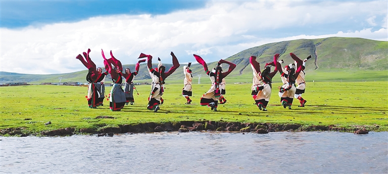 近年來,那曲文旅局以那曲傳統(tǒng)鍋莊舞展演為突破口,進(jìn)一步推進(jìn)那曲優(yōu)秀傳統(tǒng)文化創(chuàng)造性轉(zhuǎn)化和創(chuàng)新性發(fā)展,全力打響那曲鍋莊舞品牌?!D為那曲市群眾藝術(shù)鍋莊隊(duì)隊(duì)員在草原上跳鍋莊舞。(那曲市文旅局非遺處提供)