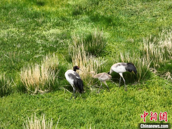 7月10日,在海拔4700米的西藏自治區(qū)那曲市申扎縣濕地里,黑頸鶴一家在悠閑覓食。中新社記者 貢嘎來松 攝