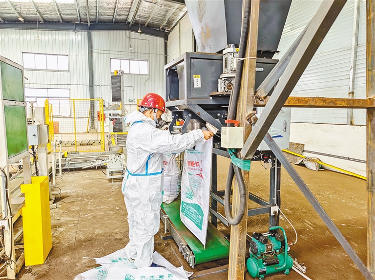 圖為在措美縣哲古社區(qū)有機(jī)肥加工廠,工人正把調(diào)配好的有機(jī)肥裝袋。通訊員 王利軍 攝
