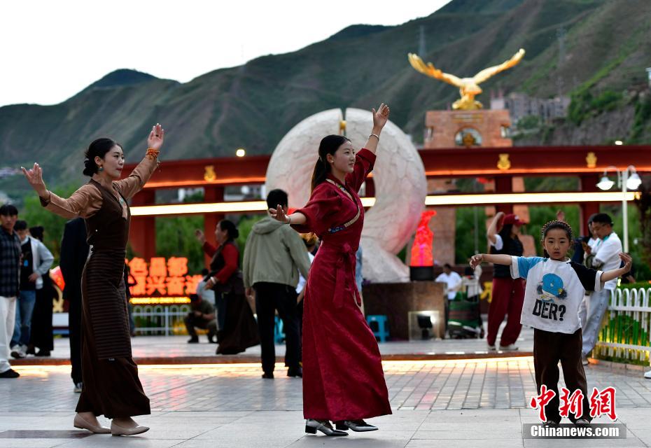 7月13日,西藏昌都瀾滄江天津廣場(chǎng)上,鍋莊舞愛(ài)好者踏歌起舞,舞出夏日夜間精彩。中新社記者 李林 攝