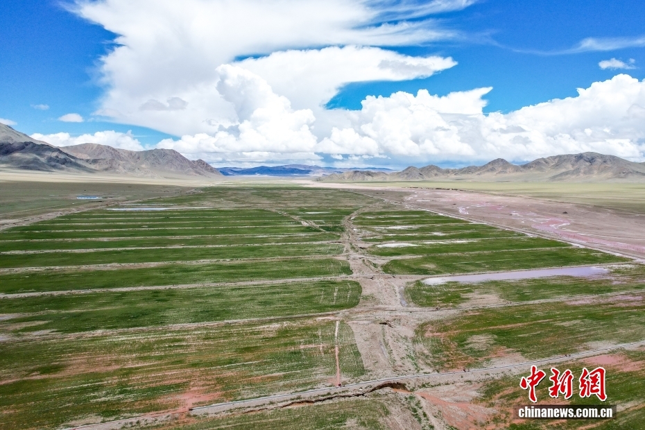 7月20日,航拍西藏阿里地區(qū)革吉縣文布當桑鄉(xiāng)的人工種草基地。為解決當?shù)囟旧笥貌堇щy,減輕天然草場壓力,2016年起文布當桑鄉(xiāng)規(guī)劃建設人工種草基地。截至2024年,已種植人工草場3590畝,草業(yè)收入229.3萬元人民幣,有效帶動當?shù)剞r(nóng)牧民就業(yè)創(chuàng)收和推動生態(tài)可持續(xù)發(fā)展。(無人機照片)中新社記者 張祥毅 攝