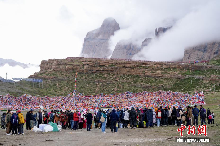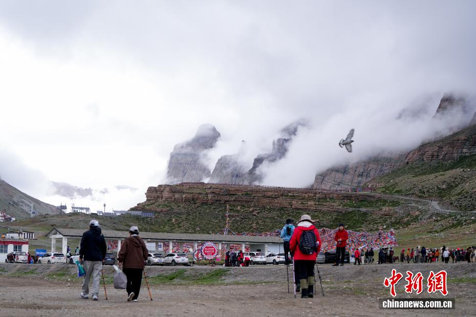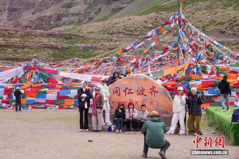 7月21日,游客在岡仁波齊山腳下的經(jīng)幡廣場打卡拍照。岡仁波齊位于西藏阿里地區(qū)普蘭縣境內(nèi),是岡底斯山的主峰,也是藏傳佛教的神山之一,每年吸引眾多信徒前往轉(zhuǎn)山,并衍生出徒步旅行的經(jīng)典路線。每年來自國內(nèi)外的徒步旅行者為當(dāng)?shù)貏?chuàng)造就業(yè)機(jī)會的同時,也推動了文旅產(chǎn)業(yè)的發(fā)展。中新社記者 張祥毅 攝