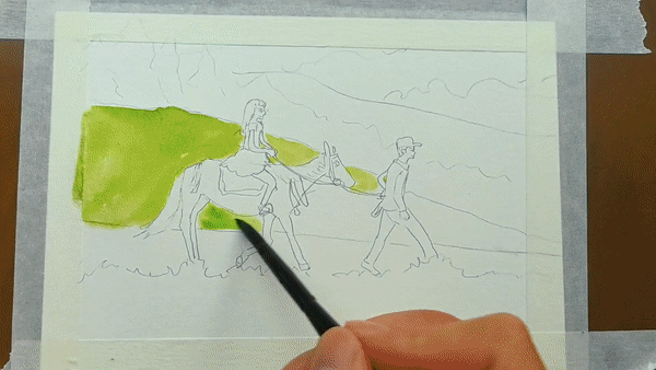 展開畫紙,最先捕捉到的是夏日魯朗層次豐富的綠意:嫩綠的草地鋪展開來,湖水映出清澈的藍綠色澤,遠處的山巒泛著淡淡青色,層層疊疊。道路在明媚的陽光下,潔白如雪,在綠色中蜿蜒,串聯(lián)起一個個藏式村落。