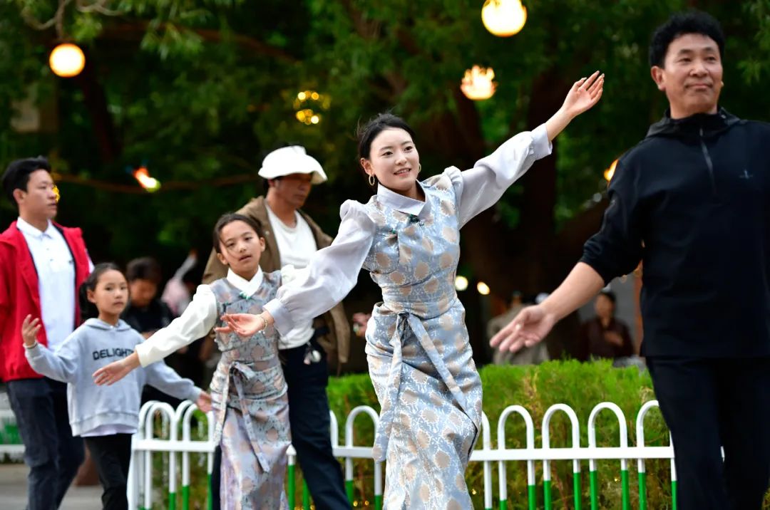 7月13日,西藏昌都瀾滄江天津廣場上,鍋莊舞愛好者踏歌起舞,舞出夏日夜間精彩。