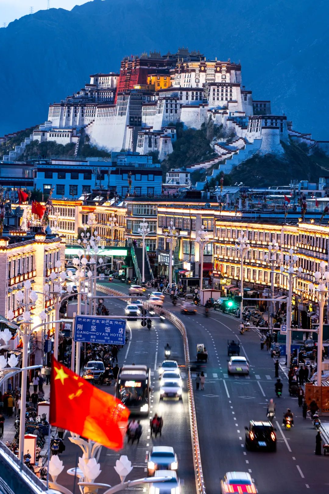7月14日晚,在西藏拉薩,亮燈后的布達(dá)拉宮與北京東路交相輝映,夜色璀璨奪目。