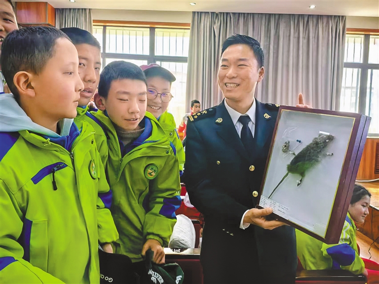 “同學們,這個圓柱形的赤褐色小蟲子,大家知道是什么嗎?它可是木材的‘隱形殺手’……”近期,在拉薩市第七中學課堂上,海關(guān)關(guān)員通過實物標本展示,向120余名師生生動講解檢疫性有害生物雙鉤異翅長蠹的危害?;顒蝇F(xiàn)場,海關(guān)關(guān)員通過展示外來入侵物種標本、講解“異寵”及外來物種入侵危害知識,幫助同學們了解《中華人民共和國生物安全法》等相關(guān)法律法規(guī),引導青少年樹立生物安全意識,積極守護生態(tài)安全。