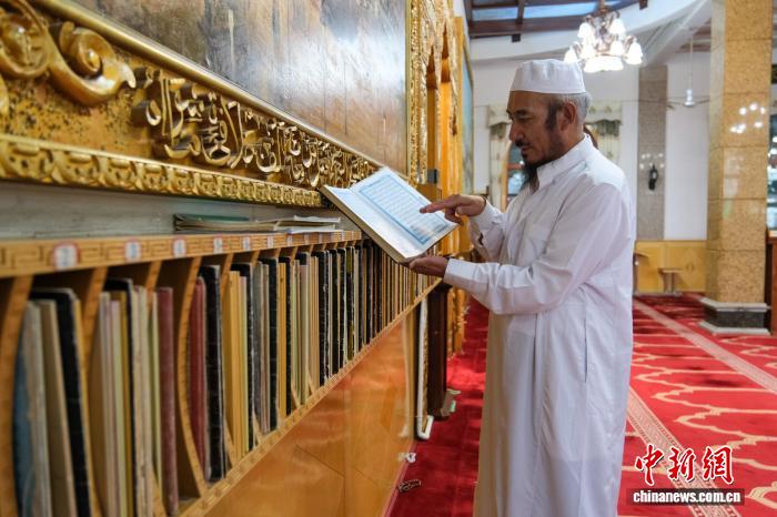 8月1日,拉薩市政協(xié)副主席、清真大寺教長亞古展示阿拉伯文和藏文對照的《古蘭經(jīng)選》。中新社記者 江飛波 攝