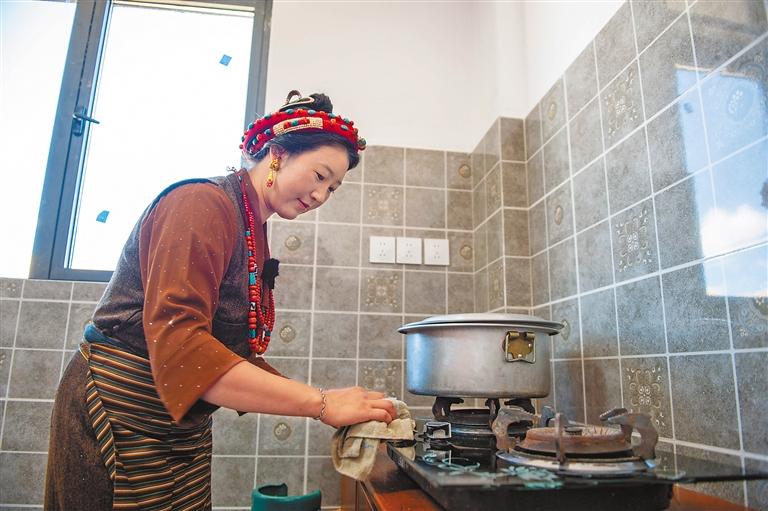 定結縣乃村村民在新房內收拾廚房。記者 旦增嘎瓦 攝