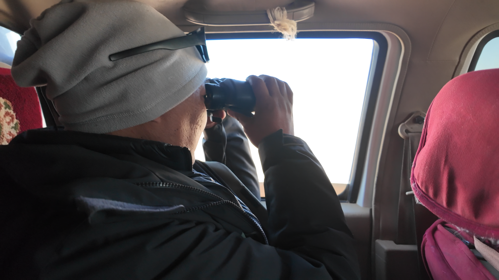 為了拍下野保員的日常工作以及藏羚羊大遷徙的宏大場面,我們一行跟隨巡護(hù)車,向著保護(hù)區(qū)核心區(qū)進(jìn)發(fā)。路面逐漸從“蜿蜒崎嶇的溪流”變成“波濤洶涌的大?!保揭败噧?nèi)好像一個(gè)迪斯科舞池,每一件東西都像被賦予了生命一般蹦蹦跳跳,伴隨著我們這些乘客的驚呼,連同引擎的轟鳴一起,揉碎在無邊荒原的呼嘯風(fēng)聲中。