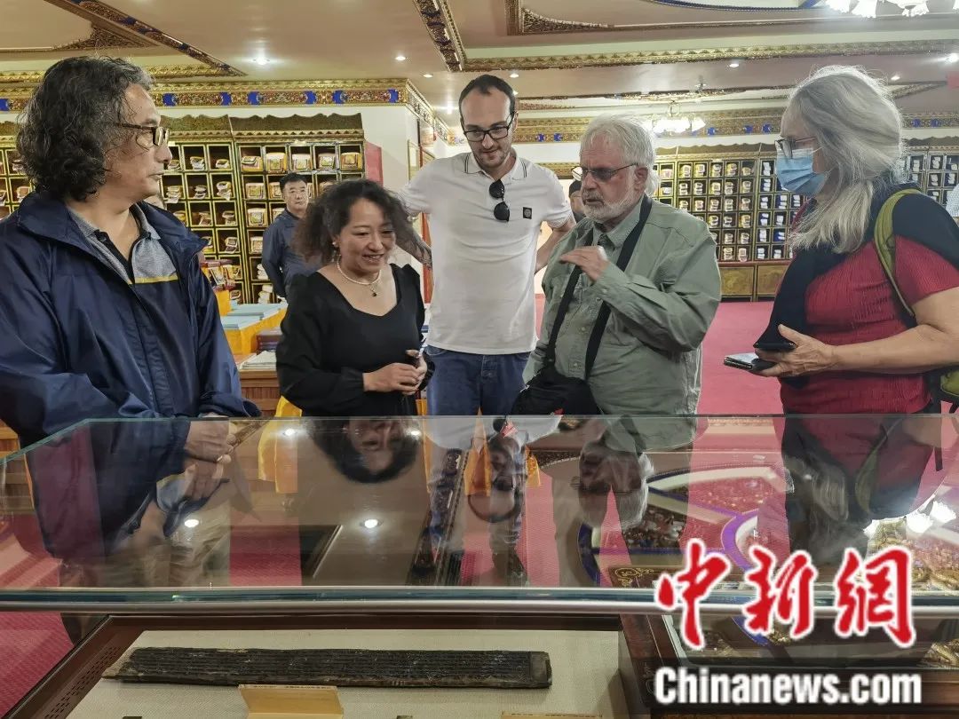圖為2023年9月20日,外籍專家學(xué)者參觀西藏大學(xué)圖書館藏文古籍研究所。中新社記者 趙延 攝