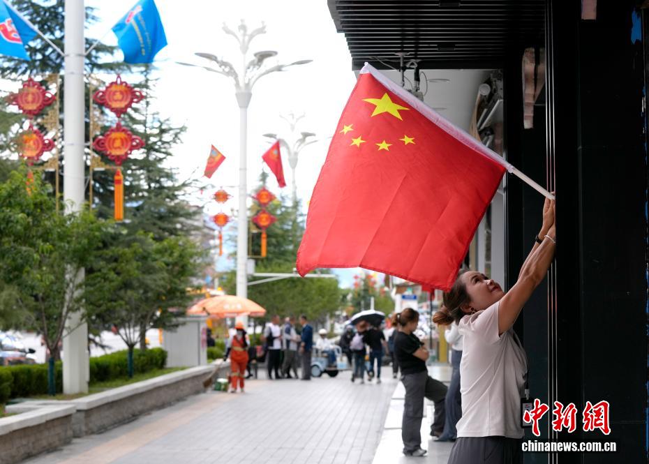 8月19日,隨著西藏自治區(qū)成立60周年慶?;顒?dòng)臨近,拉薩氛圍濃。拉薩街頭,處處是張燈結(jié)彩的盛景,洋溢著一派祥和與歡騰的氛圍。圖為拉薩北京中路商鋪懸掛國(guó)旗。中新社記者 李林 攝