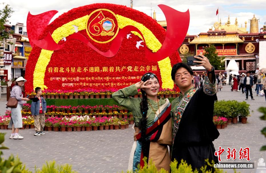 8月19日,隨著西藏自治區(qū)成立60周年慶?;顒?dòng)臨近,拉薩氛圍濃。拉薩街頭,處處是張燈結(jié)彩的盛景,洋溢著一派祥和與歡騰的氛圍。圖為游客在拉薩大昭寺廣場(chǎng)上的大慶宣傳標(biāo)語(yǔ)前留念。中新社記者 李林 攝