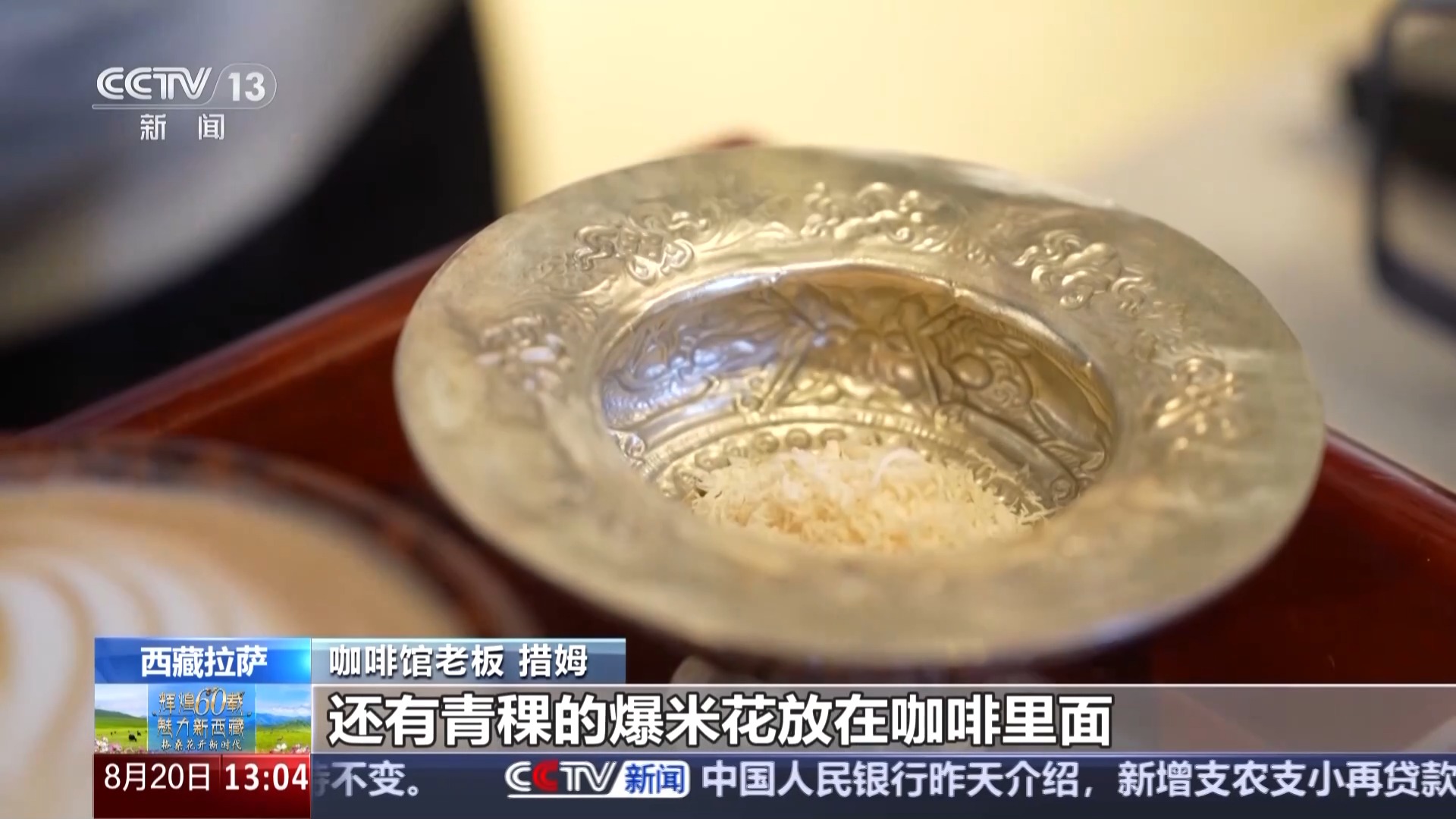 咖啡館老板 措姆:這款是我們店里面賣得最火爆的一款原創(chuàng)產(chǎn)品——拉薩拿鐵,我們準(zhǔn)備了牦牛奶的奶渣、酥油、青稞的爆米花放在咖啡里,讓客人體驗(yàn)到西藏本地食材和咖啡融合的感覺。