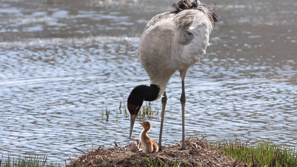 黑頸鶴和出生不久的小黑頸鶴。