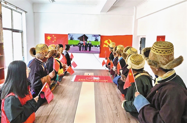 在阿里地區(qū)噶爾縣扎西崗鄉(xiāng)典角村,57歲的次仁久美和家人一同觀看慶祝大會(huì)盛況,熱烈的氛圍感染著屋里的每一個(gè)人?!耙郧拔覀冏〉氖鞘^泥土壘的房子,漏風(fēng)又漏雨,后來換成了土木房,可還是抵不住冬天的寒風(fēng)。現(xiàn)如今,鋼筋混凝土的房子亮堂又暖和?!贝稳示妹勒f,“好日子是黨給的!作為一名黨員,我要帶著大家一起,不僅把日子過得紅火,更要守好祖國(guó)的每一寸土地?!?/p>