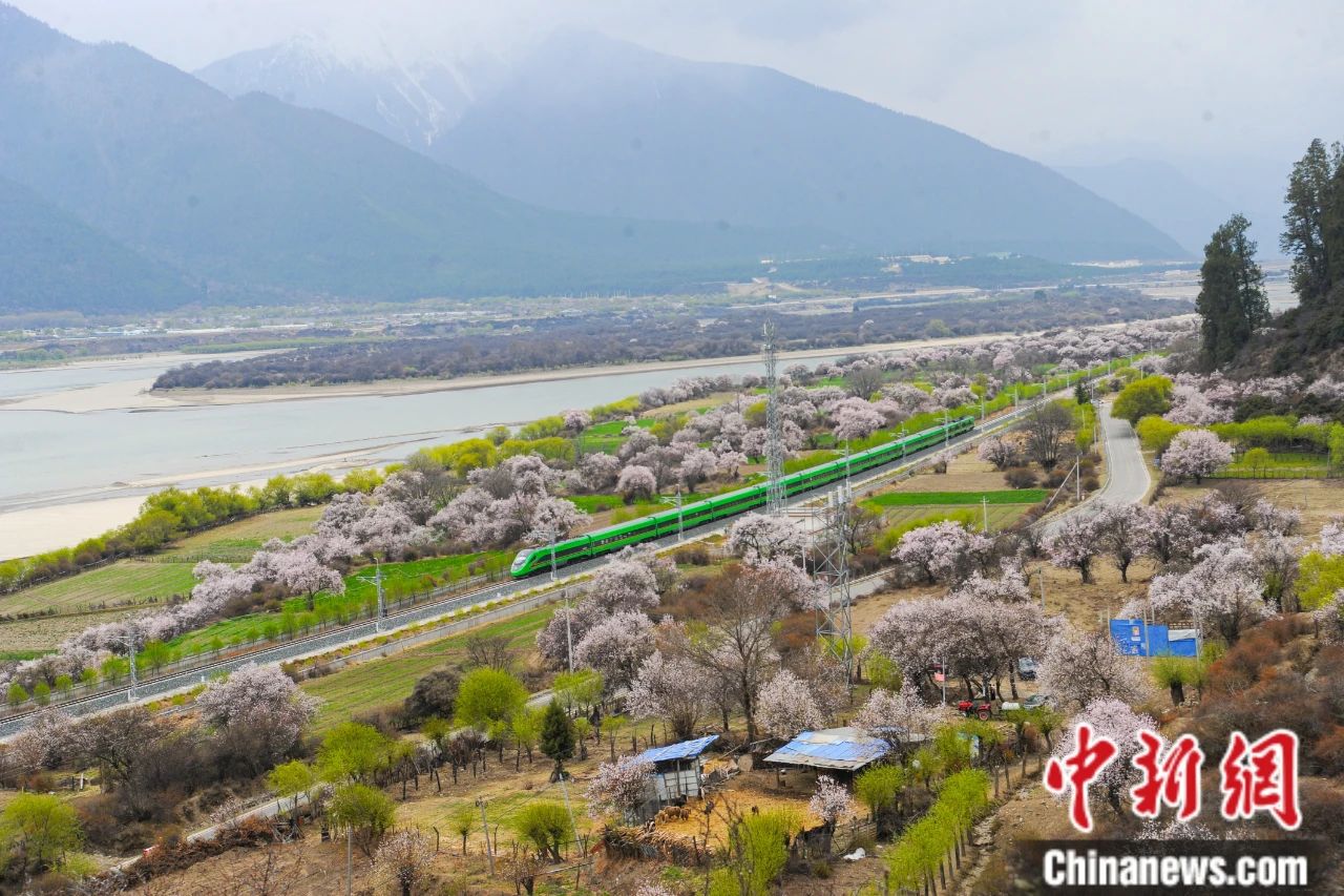 圖為穿梭在桃花林中的拉林鐵路高原復(fù)興號。 中新社記者 貢嘎來松 攝