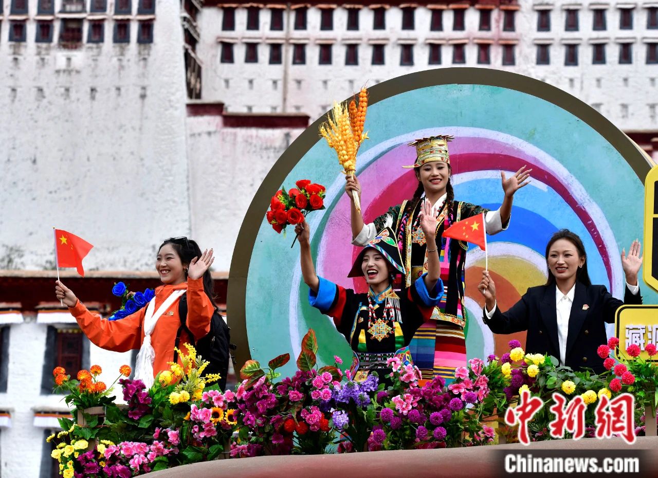 圖為西藏自治區(qū)成立60周年慶祝大會(huì)中的林芝彩車方隊(duì)。中新社記者 李林 攝