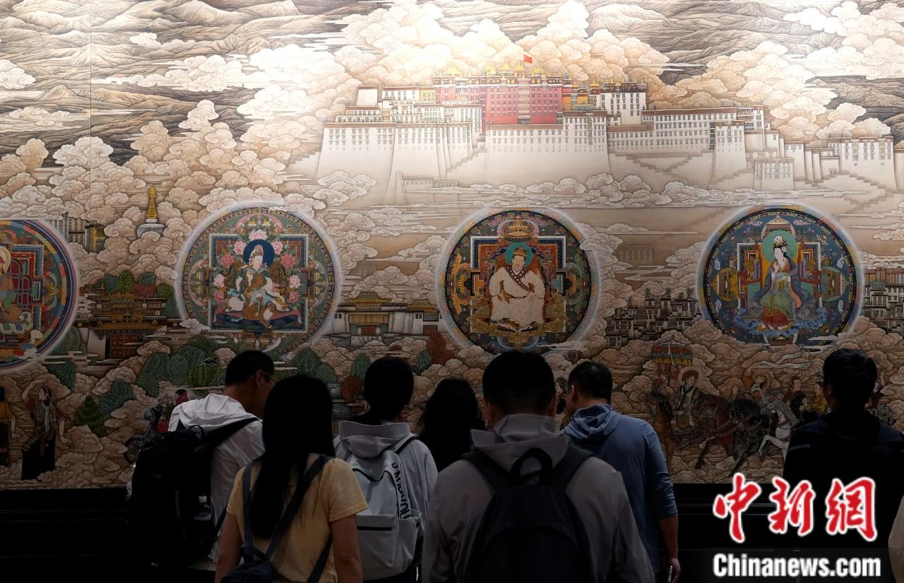 圖為游客參觀西藏博物館內(nèi)展出的唐卡。中新社記者 李林 攝