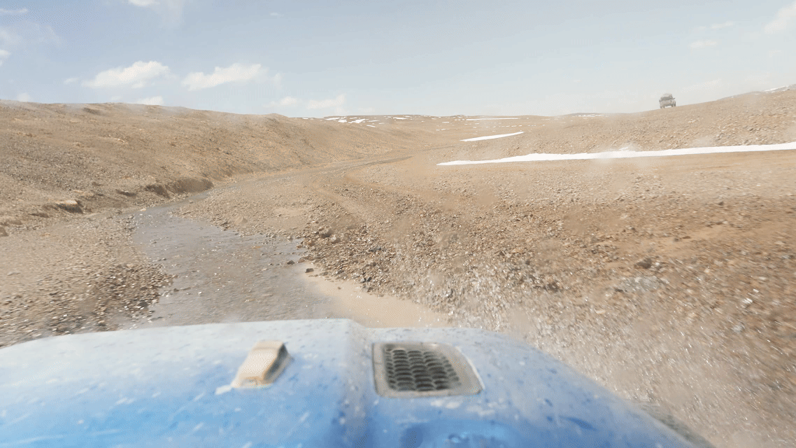 路面逐漸從“蜿蜒崎嶇的溪流”變成“波濤洶涌的大海”,越野車里好像一個迪斯科舞池,每件東西都像被賦予了生命一般蹦蹦跳跳,伴隨著我們這些乘客的驚呼,連同引擎的轟鳴一起,被揉碎在無邊荒原的呼嘯風聲中。