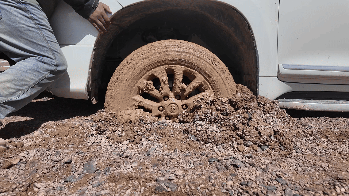 陷在濕軟泥地中的巡護車車胎。
