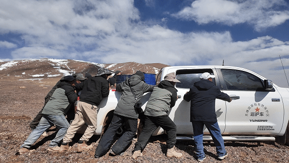 眼前這一幕仿佛預示著藏羚羊的遷徙之路和我們的巡護之路同樣艱難。再往前行駛不遠,車隊中的皮卡車肉眼可見在泥里越陷越深。