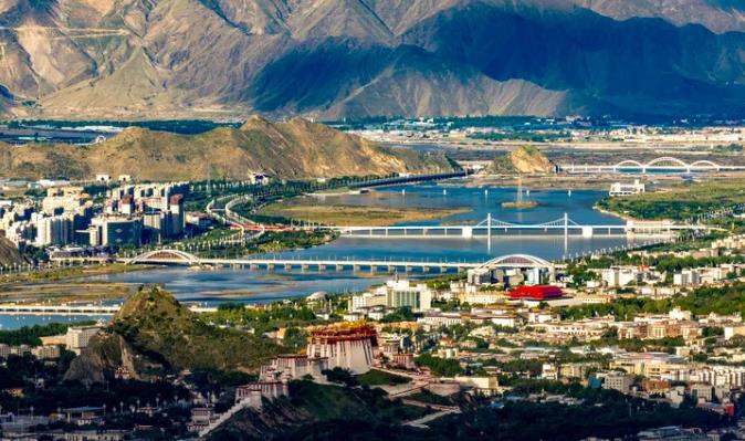 這是2025年7月30日拍攝的拉薩河風光,由近及遠分別是連心橋、柳梧大橋、和美橋和青藏鐵路拉薩河特大橋。圖片來源:新華社