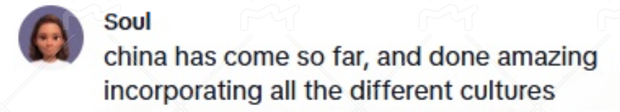 網(wǎng)友@Soul指出,“中國(guó)已經(jīng)取得了長(zhǎng)足的進(jìn)步,在融合各種不同文化方面做出了令人驚嘆的成就。”