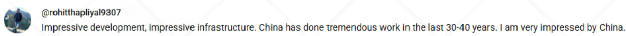 網(wǎng)友@rohitthapliyal9307說(shuō)道,“多么令人矚目的發(fā)展,多么令人印象深刻的基礎(chǔ)設(shè)施。中國(guó)在過(guò)去三四十年里做出了巨大的貢獻(xiàn)。我對(duì)中國(guó)印象深刻。”