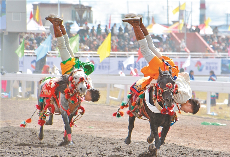 來自四川、青海及西藏本地的馬術(shù)隊(duì)英姿颯爽,躍馬揚(yáng)鞭;千人共舞《禮贊甲子》,舞步豪邁,衣袂飛揚(yáng),再現(xiàn)西藏六十年的滄桑巨變;器樂合奏《風(fēng)從浙江來·樂在那曲揚(yáng)》則巧妙融合江南韻律與草原風(fēng)情,奏響對(duì)口支援的深情厚誼;《馱鹽之歌》悠揚(yáng)響起,仿佛將人們帶回了古老的歲月,展現(xiàn)了高原兒女堅(jiān)韌不拔的精神……賽馬場(chǎng)核心區(qū)域,傳統(tǒng)馬術(shù)與現(xiàn)代藝術(shù)在這里交相輝映,引來掌聲如潮、喝彩不絕。