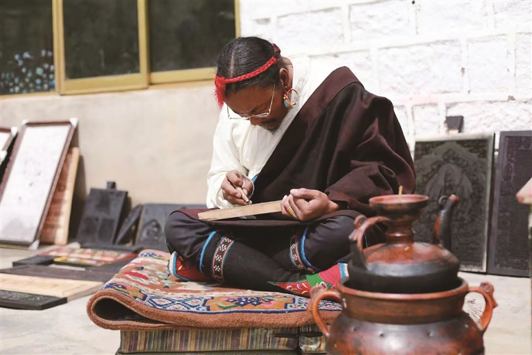 在傳承技藝的過程中,斯曲也面臨著不少挑戰(zhàn)。教徒弟時最大的困難就是讓他們靜下心來,因為這門手藝需要從小學(xué)起,不僅要學(xué)習(xí)拿工具,還要學(xué)習(xí)認(rèn)字和雕刻?!耙郧肮馐菍W(xué)習(xí)雕刻文字,起碼要9個月時間,現(xiàn)在的孩子都很聰明,兩年基本就能掌握雕刻技藝?!彼骨牢康卣f。