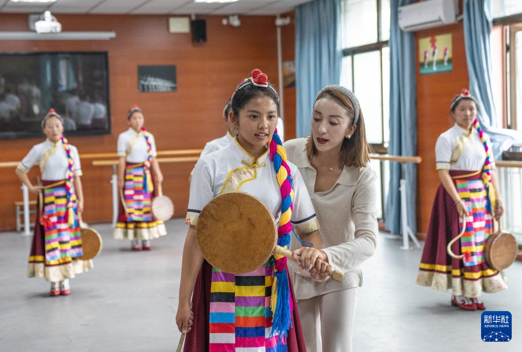 9月9日,在拉薩市第二中等職業(yè)技術(shù)學(xué)校,尼瑪卓瑪老師(右二)指導(dǎo)孩子們舞蹈動作。新華社記者 丁增尼達 攝