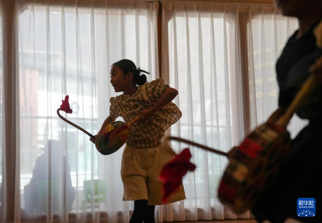 9月11日,在拉薩市實驗小學(xué),孩子在練習(xí)熱巴舞間隙捧起繪有彩紋的熱巴鼓。新華社記者 晉美多吉 攝