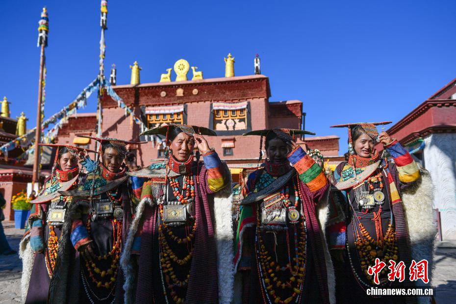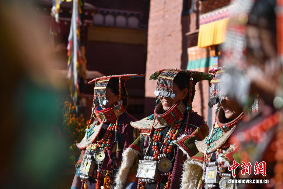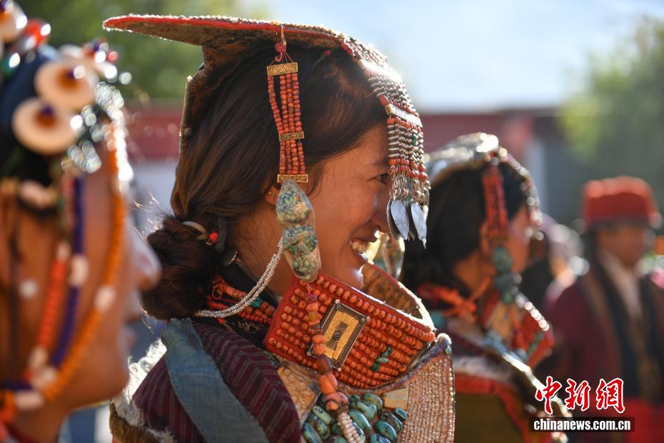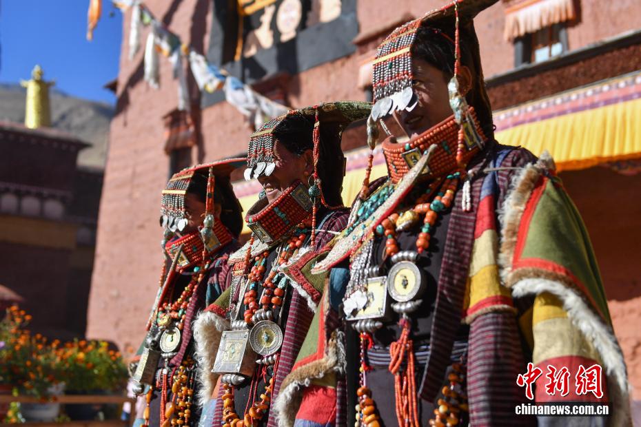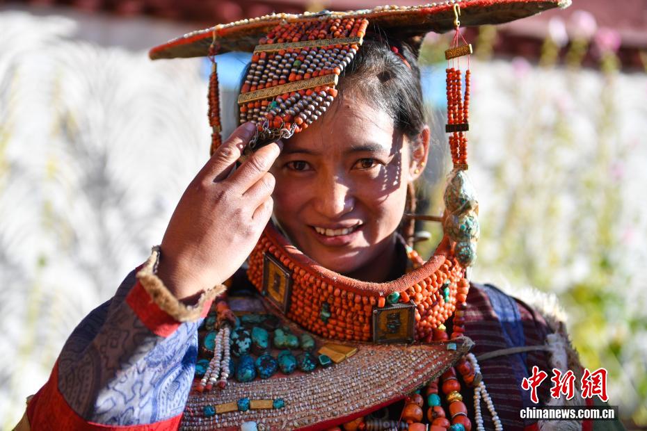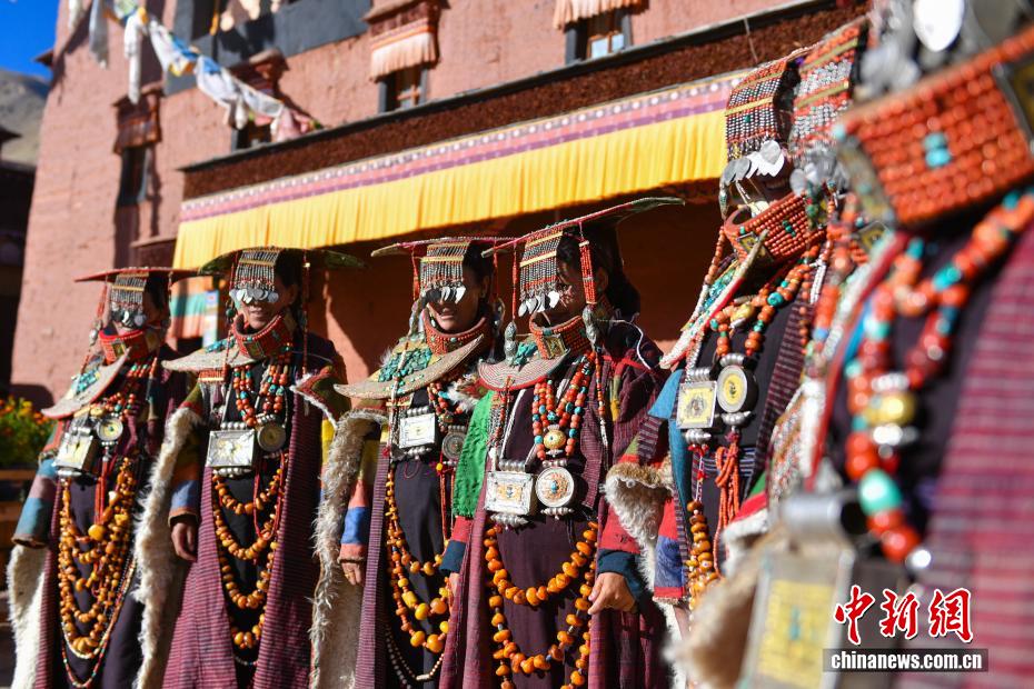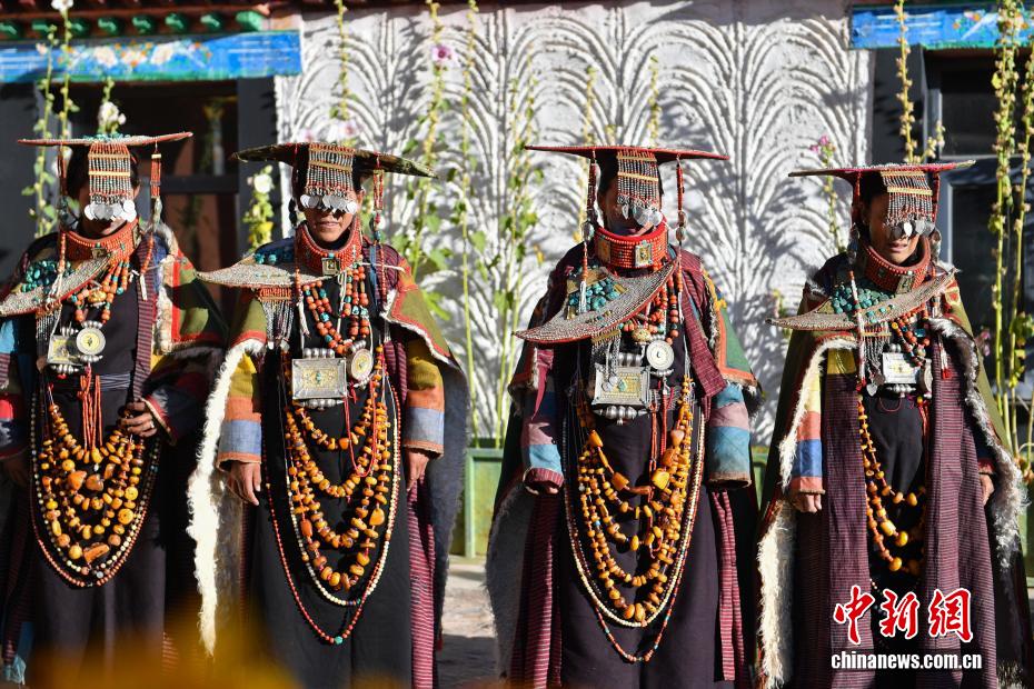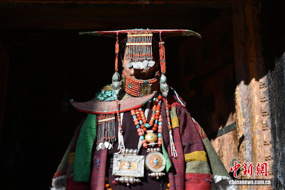 9月23日,西藏自治區(qū)阿里地區(qū)普蘭縣,至今保留著獨(dú)特的藏族服飾——普蘭服飾,它是中國(guó)國(guó)家級(jí)非物質(zhì)文化遺產(chǎn)。普蘭服飾已有1000多年的歷史,其中最精美、最獨(dú)特的是婦女的“孔雀服飾”,普蘭縣科迦村里有7戶人家保存著7套祖?zhèn)鞣?,一套重達(dá)20多公斤,裝飾有黃金、白銀、松石、瑪瑙、珊瑚、珍珠等,承載和沉淀了百年時(shí)光,堪稱“穿在身上的千年史”。時(shí)至今日,這種美麗的服飾文化還在當(dāng)?shù)貍鞒兄?。圖為西藏阿里地區(qū)普蘭縣科迦村,村民在展示普蘭服飾。貢確 攝