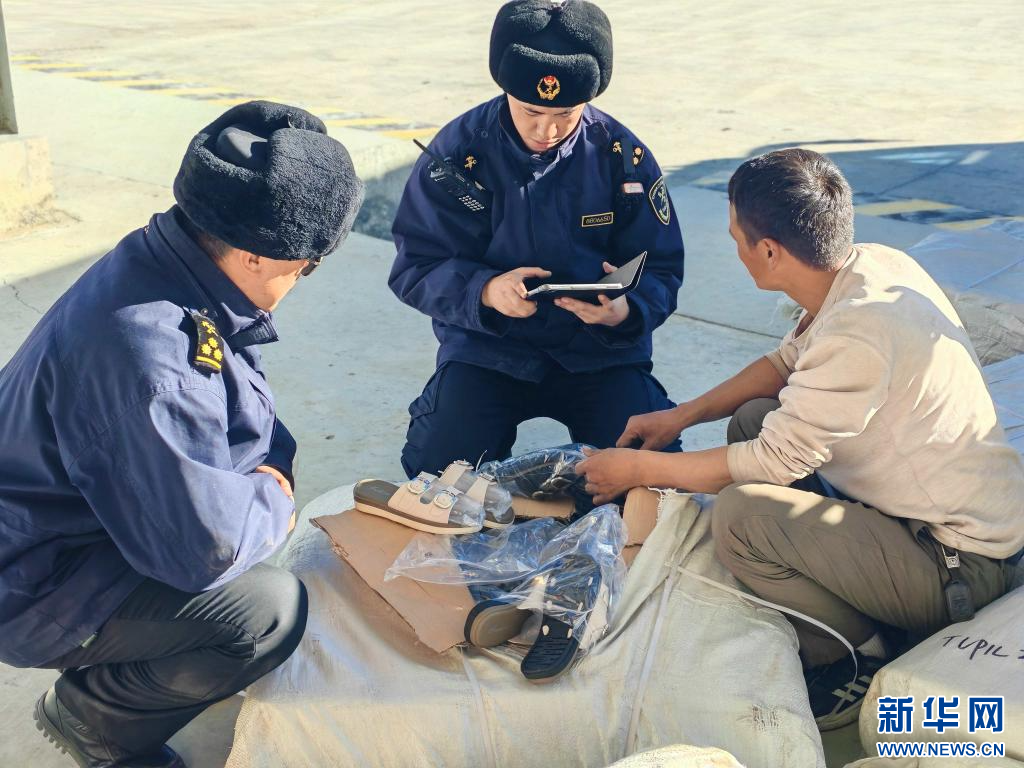 23日,拉薩海關(guān)所屬日喀則海關(guān)關(guān)員在里孜口岸查驗出口貨物。(拉薩海關(guān)供圖)