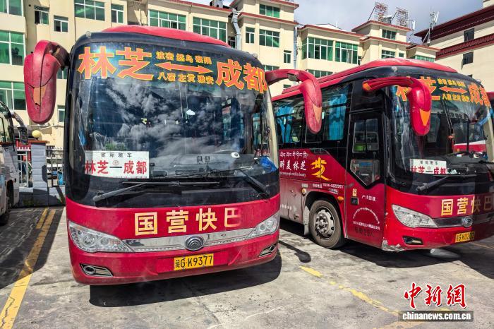 9月29日,西藏自治區(qū)林芝市客運(yùn)中心停放的林芝至成都客運(yùn)大巴車。牛長(zhǎng)城 攝