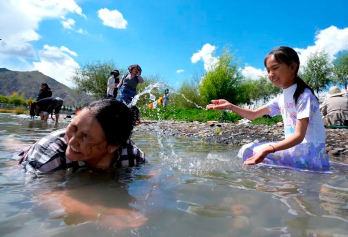 2025年9月13日,民眾在拉薩河邊享受沐浴節(jié)時(shí)光。沐浴節(jié),藏語(yǔ)稱(chēng)為“嘎瑪日吉”。中新社記者 李林 攝
