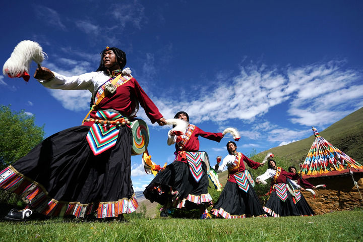 2020年7月1日,在西藏山南市瓊結(jié)縣,久河村卓舞隊(duì)的隊(duì)員在表演國家級(jí)非遺項(xiàng)目“久河卓舞”。新華社記者 詹彥 攝