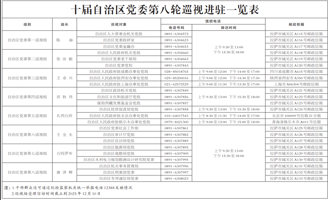 據(jù)悉,各巡視組將在被巡視單位工作50天左右,期間設(shè)專門值班電話和郵政信箱,開通信訪意見箱等信訪渠道,主要受理反映被巡視黨組織領(lǐng)導(dǎo)班子及其成員、下一級黨組織主要負(fù)責(zé)人和重要崗位領(lǐng)導(dǎo)干部問題的來信來電來訪,重點(diǎn)是關(guān)于違反政治紀(jì)律、組織紀(jì)律、廉潔紀(jì)律、群眾紀(jì)律、工作紀(jì)律、生活紀(jì)律等方面的舉報和反映。巡視組受理信訪時間截止到2025年12月10日。
