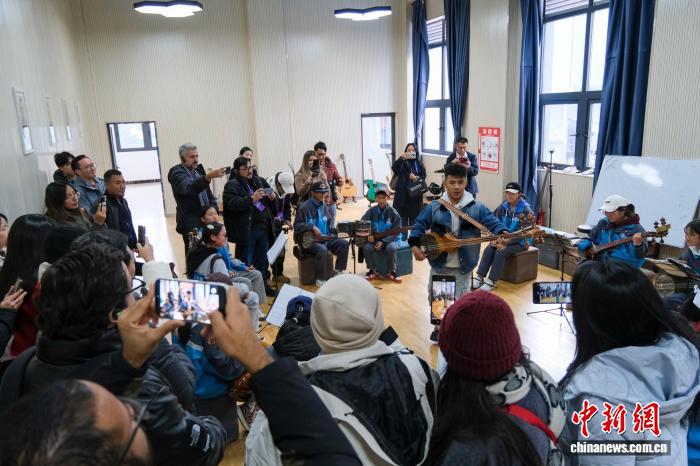 10月28日,拉美18個(gè)國(guó)家的21名記者、編輯等媒體從業(yè)者在西藏自治區(qū)林芝市巴宜區(qū)中學(xué)參訪,觀看師生們演奏藏族扎念琴。中新社記者 江飛波 攝
