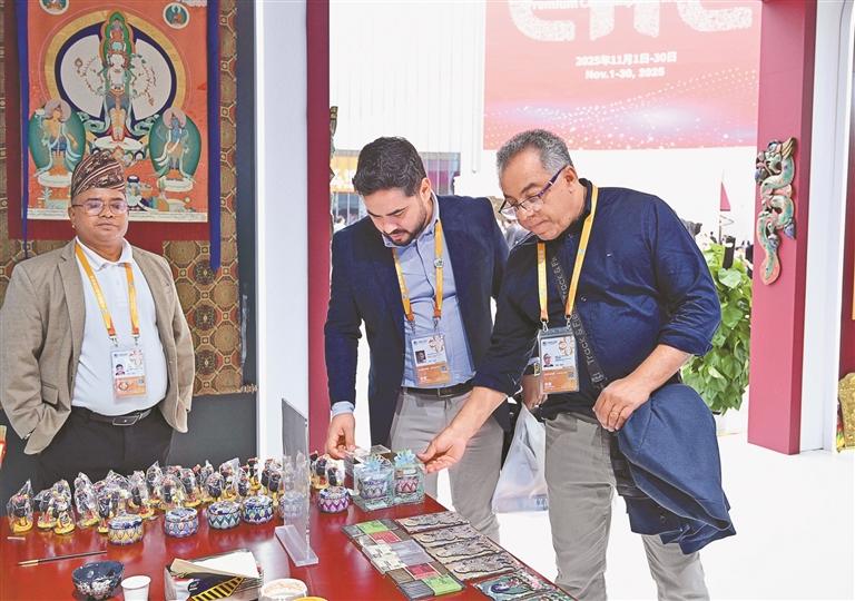 圖為第八屆中國國際進(jìn)口博覽會西藏館內(nèi)的客人在選購商品。記者 王敏 索朗瓊珠 嘎松卓瑪 攝影報道