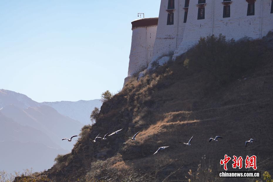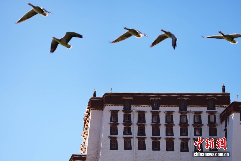 11月17日,西藏拉薩迎來大批越冬候鳥。拉薩河、宗角祿康公園等地,成為了它們的棲息天堂。在宗角祿康公園內,赤麻鴨、斑頭雁成群結隊,時而低頭覓食,時而水中嬉戲。它們的身影引得市民和游客紛紛駐足觀賞、拍照留念,構成了一幅人與自然和諧共生的美麗畫卷。圖為斑頭雁與布達拉宮同框。貢確 攝