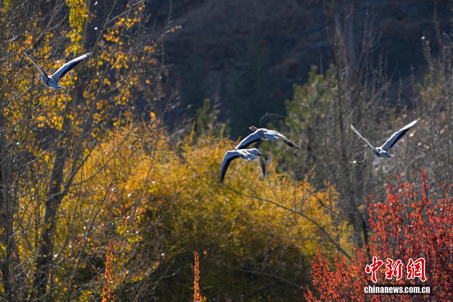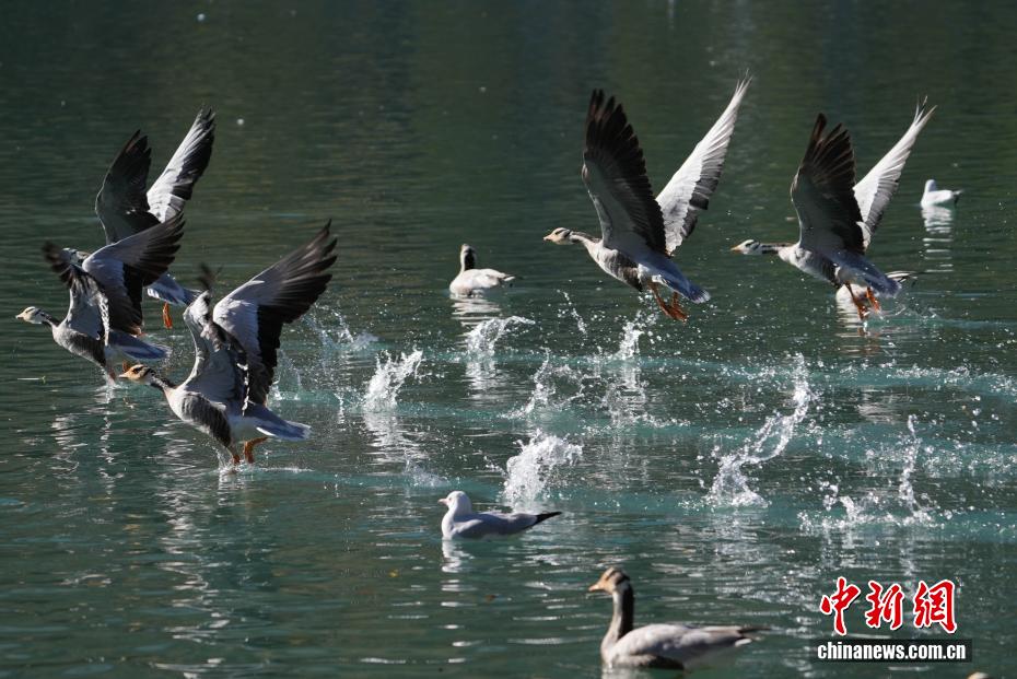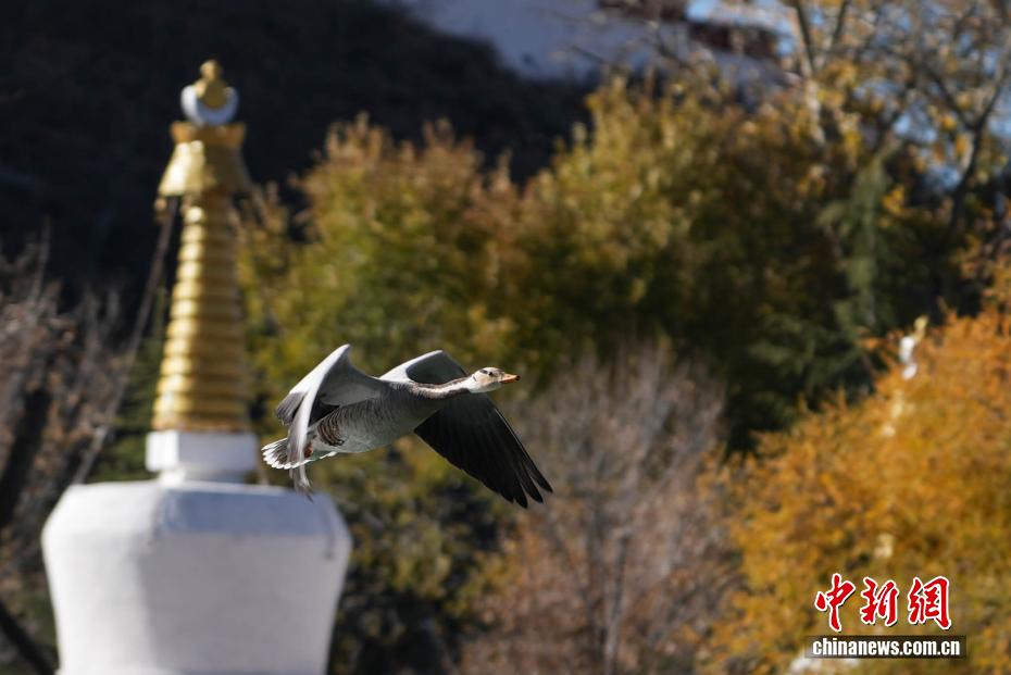 11月17日,西藏拉薩迎來大批越冬候鳥。拉薩河、宗角祿康公園等地,成為了它們的棲息天堂。在宗角祿康公園內,赤麻鴨、斑頭雁成群結隊,時而低頭覓食,時而水中嬉戲。它們的身影引得市民和游客紛紛駐足觀賞、拍照留念,構成了一幅人與自然和諧共生的美麗畫卷。圖為斑頭雁從宗角祿康公園上方飛過。貢確 攝
