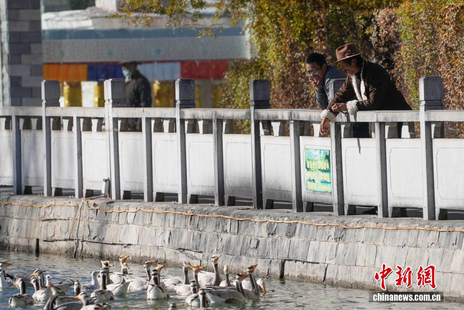 11月17日,西藏拉薩迎來大批越冬候鳥。拉薩河、宗角祿康公園等地,成為了它們的棲息天堂。在宗角祿康公園內,赤麻鴨、斑頭雁成群結隊,時而低頭覓食,時而水中嬉戲。它們的身影引得市民和游客紛紛駐足觀賞、拍照留念,構成了一幅人與自然和諧共生的美麗畫卷。圖為市民在宗角祿康公園內投喂候鳥。貢確 攝