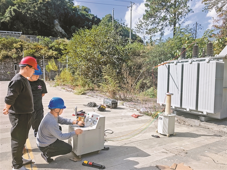 圖為國網(wǎng)察隅縣供電公司工作人員正在對變壓器進行試驗調(diào)試。