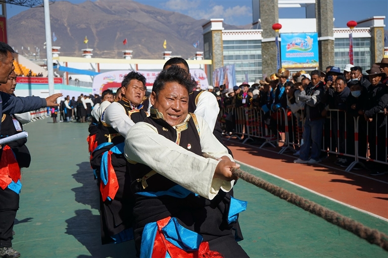 記者置身于賽場,最直觀的感受并非競技的緊張,而是一種蓬勃的生命力在盡情舒展。這里的比賽,吶喊聲帶著鄉(xiāng)音,勝利的歡呼與田間勞作時的號子相互呼應。在極具特色的“押加”比賽(即大象拔河)現(xiàn)場,來自隆子縣的扎西達杰成為全場的焦點。他穿著隆子縣的傳統(tǒng)服飾,面容質(zhì)樸神情嚴肅,裁判哨聲吹響,與對手反向?qū)乃查g,他全身的肌肉瞬間繃緊,四肢緊緊地“吸附”在地上,那是在千百次揮鎬、背負牧草中錘煉出的力量。僵持、角力,在鄉(xiāng)親的“加油”聲中,他猛然發(fā)力,贏得了比賽。