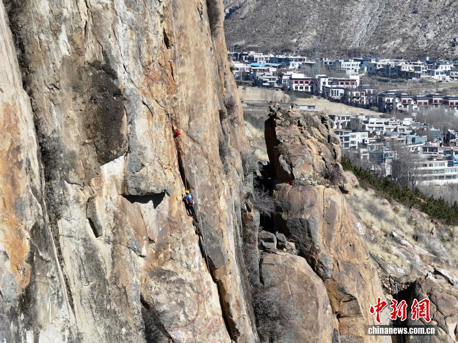 11月29日,2025西藏自治區(qū)攀巖自然巖壁公開賽在拉薩市奪底溝吉倉自然巖壁場地開賽。來自中國全國的70名運(yùn)動員、高校學(xué)生及社會攀巖愛好者參賽。(無人機(jī)照片)中新社記者 貢嘎來松 攝