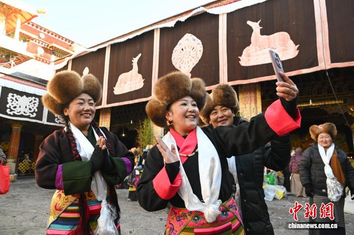 隨著藏歷十月十五白拉姆節(jié)(又稱“仙女節(jié)”)臨近,11月28日,西藏拉薩的婦女們在大昭寺跳完傳統(tǒng)舞蹈后自拍留念,迎接“仙女節(jié)”到來?!跋膳?jié)”即吉祥天母節(jié),藏語稱“白來日追”。相傳藏傳佛教最高護法神之一班丹拉姆的女兒白拉姆,不顧母親的反對與赤尊贊私定終身,班丹拉姆一怒之下將赤尊贊趕到拉薩河南岸,規(guī)定二人僅每年的藏歷十月十五日相見。中新社記者 貢嘎來松 攝